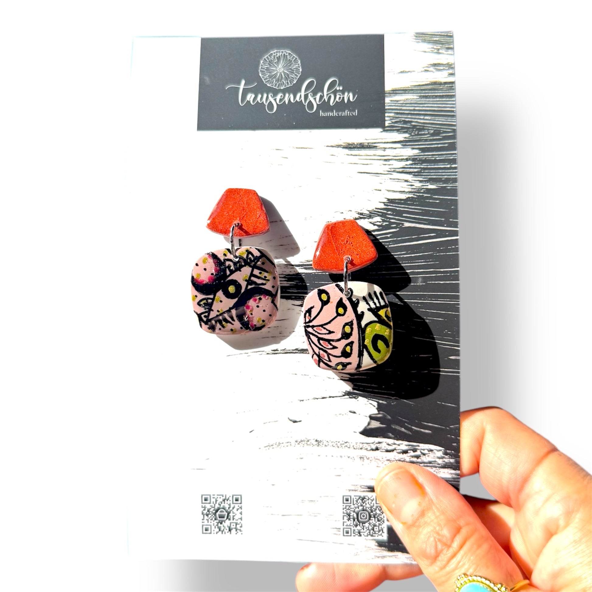 Unsere schöne Ohrringe werden aus einem ungiftigen PVC-basierten Medium namens Polymer Clay hergestellt. Wir formen es, mischen die Farben und fügen manchmal Dinge wie Folie oder Glitter hinzu, dann werden sie mit größter Sorgfalt ausgehärtet und fertiggestellt.