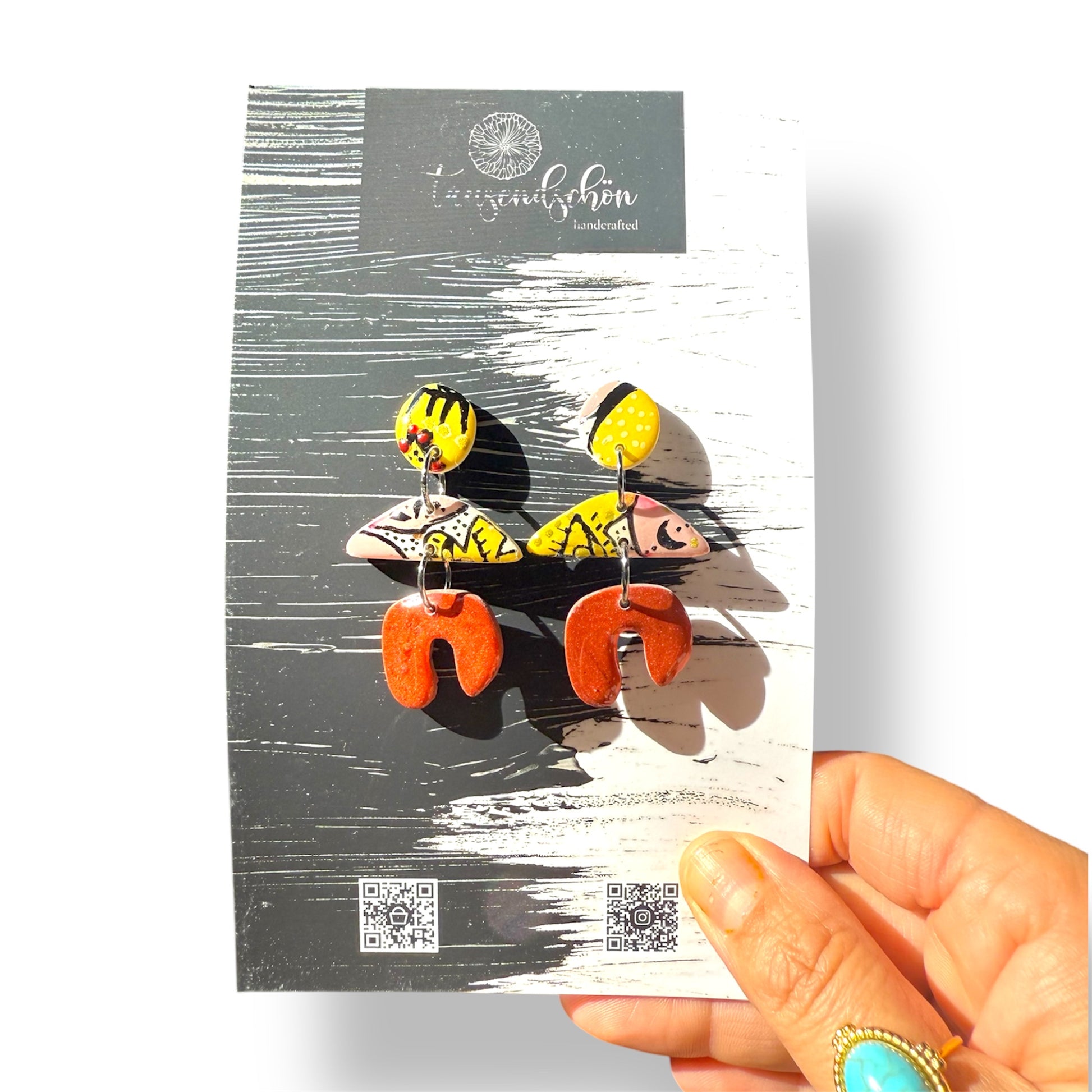 Unsere schöne Ohrringe werden aus einem ungiftigen PVC-basierten Medium namens Polymer Clay hergestellt. Wir formen es, mischen die Farben und fügen manchmal Dinge wie Folie oder Glitter hinzu, dann werden sie mit größter Sorgfalt ausgehärtet und fertiggestellt.