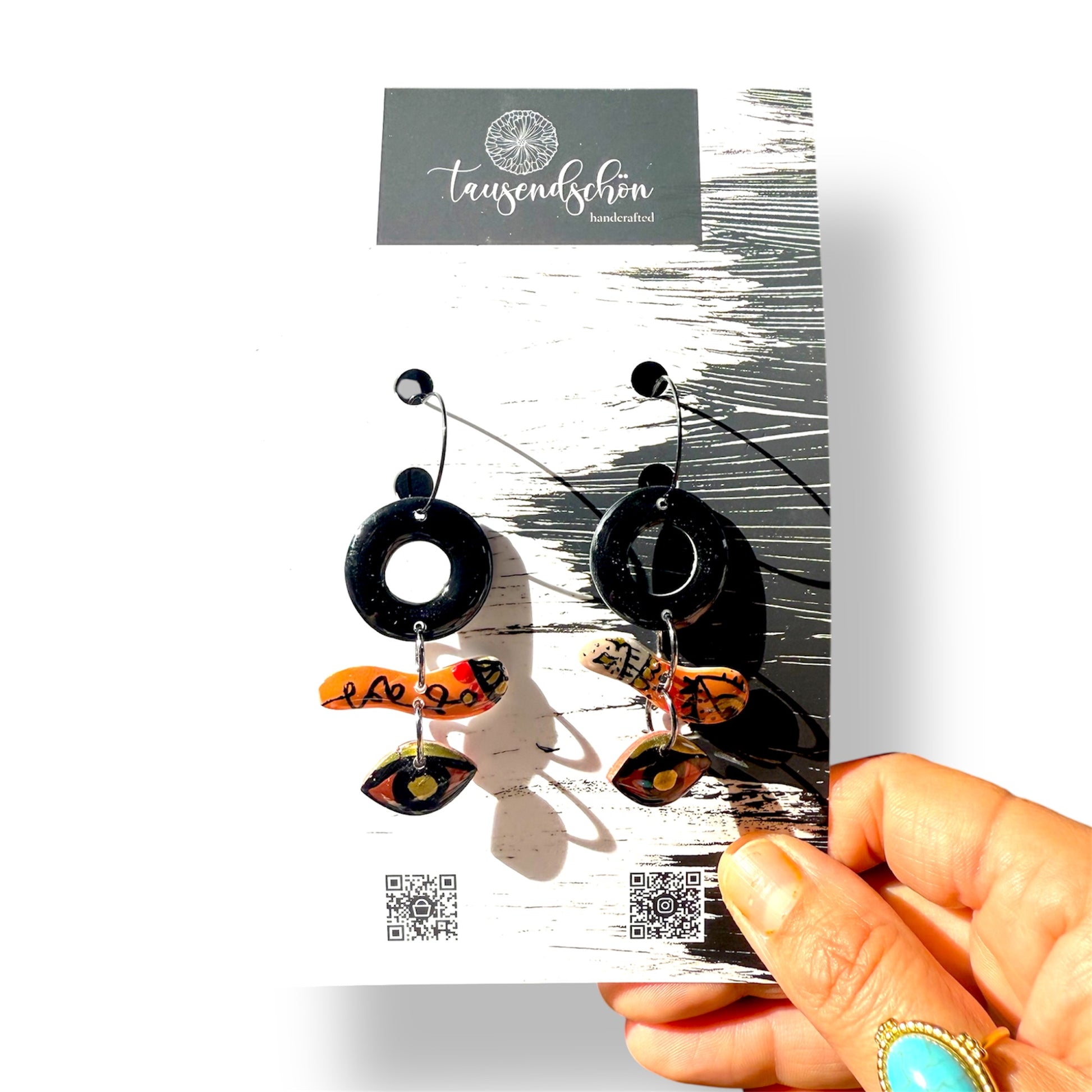 Unsere schöne Ohrringe werden aus einem ungiftigen PVC-basierten Medium namens Polymer Clay hergestellt. Wir formen es, mischen die Farben und fügen manchmal Dinge wie Folie oder Glitter hinzu, dann werden sie mit größter Sorgfalt ausgehärtet und fertiggestellt.