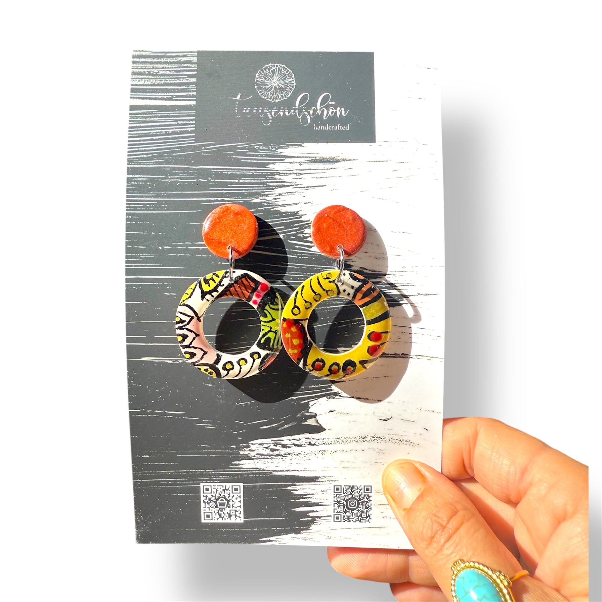 Unsere schöne Ohrringe werden aus einem ungiftigen PVC-basierten Medium namens Polymer Clay hergestellt. Wir formen es, mischen die Farben und fügen manchmal Dinge wie Folie oder Glitter hinzu, dann werden sie mit größter Sorgfalt ausgehärtet und fertiggestellt.