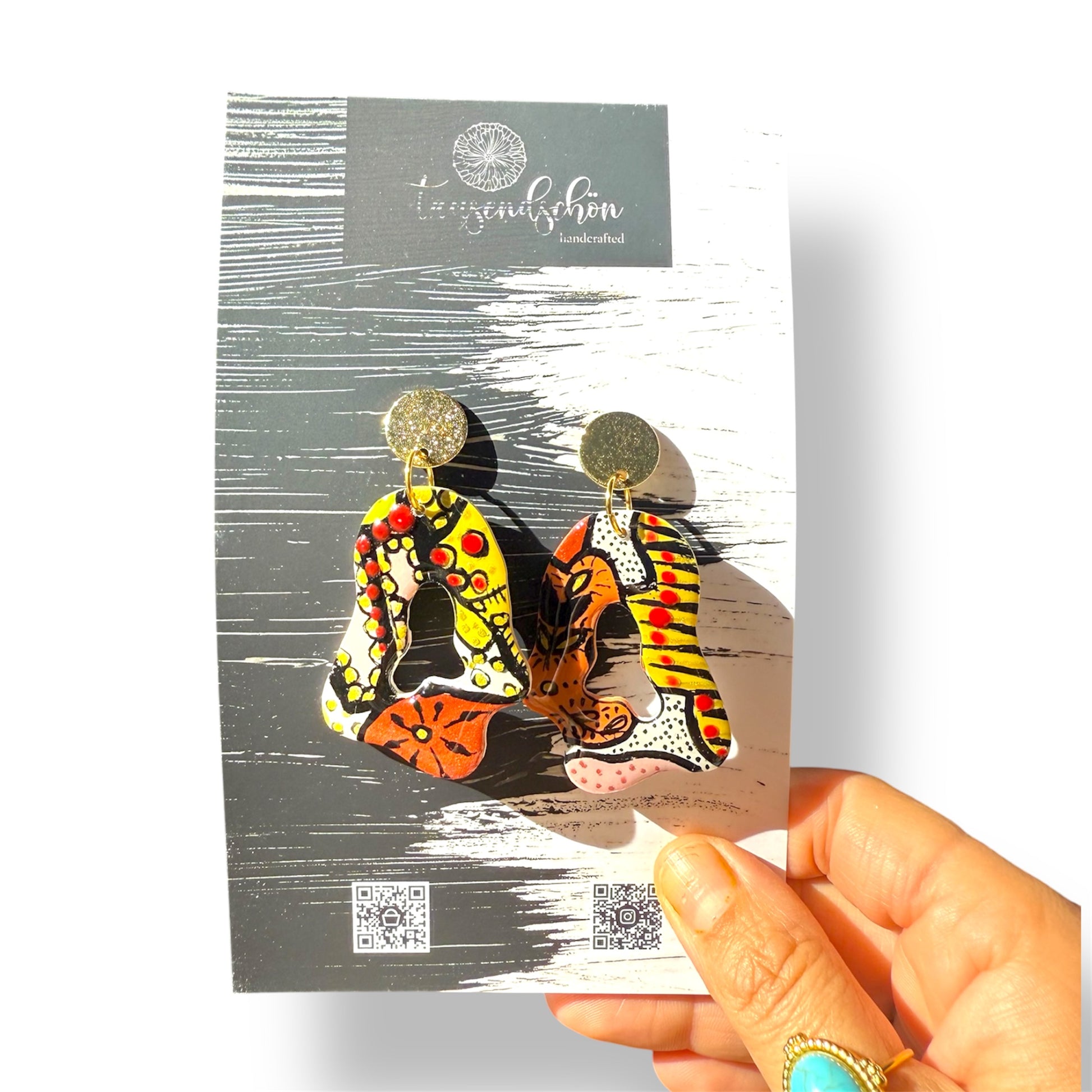 Unsere schöne Ohrringe werden aus einem ungiftigen PVC-basierten Medium namens Polymer Clay hergestellt. Wir formen es, mischen die Farben und fügen manchmal Dinge wie Folie oder Glitter hinzu, dann werden sie mit größter Sorgfalt ausgehärtet und fertiggestellt.