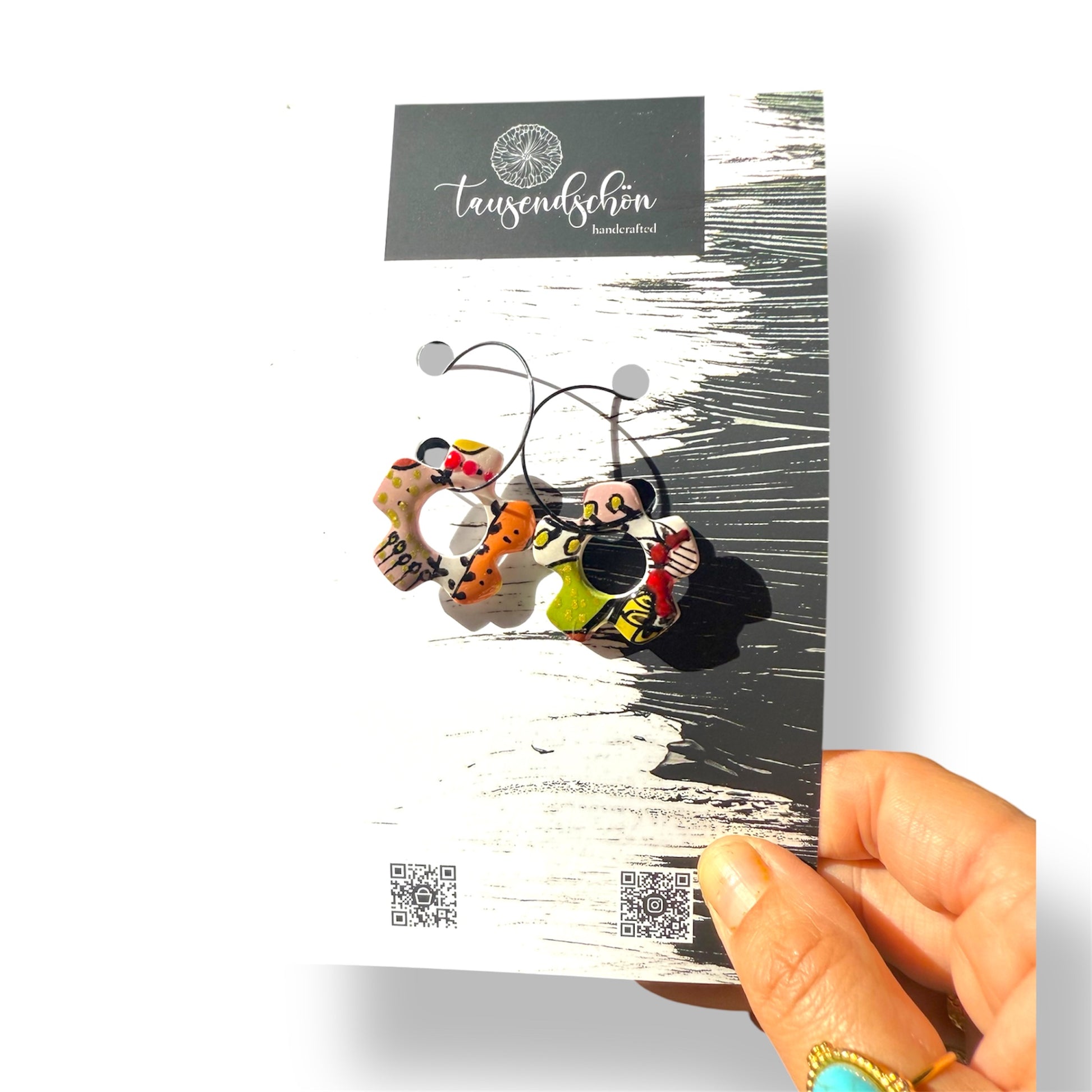 Unsere schöne Ohrringe werden aus einem ungiftigen PVC-basierten Medium namens Polymer Clay hergestellt. Wir formen es, mischen die Farben und fügen manchmal Dinge wie Folie oder Glitter hinzu, dann werden sie mit größter Sorgfalt ausgehärtet und fertiggestellt.