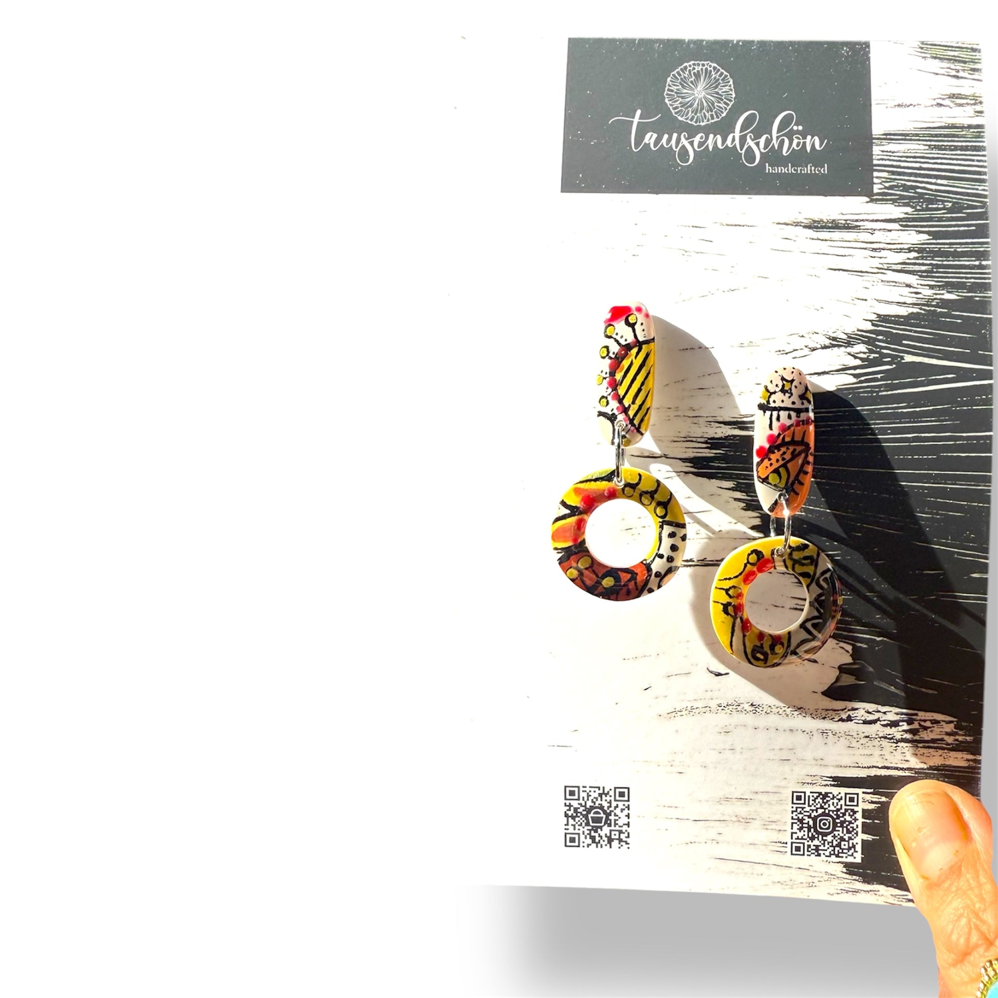 Unsere schöne Ohrringe werden aus einem ungiftigen PVC-basierten Medium namens Polymer Clay hergestellt. Wir formen es, mischen die Farben und fügen manchmal Dinge wie Folie oder Glitter hinzu, dann werden sie mit größter Sorgfalt ausgehärtet und fertiggestellt.