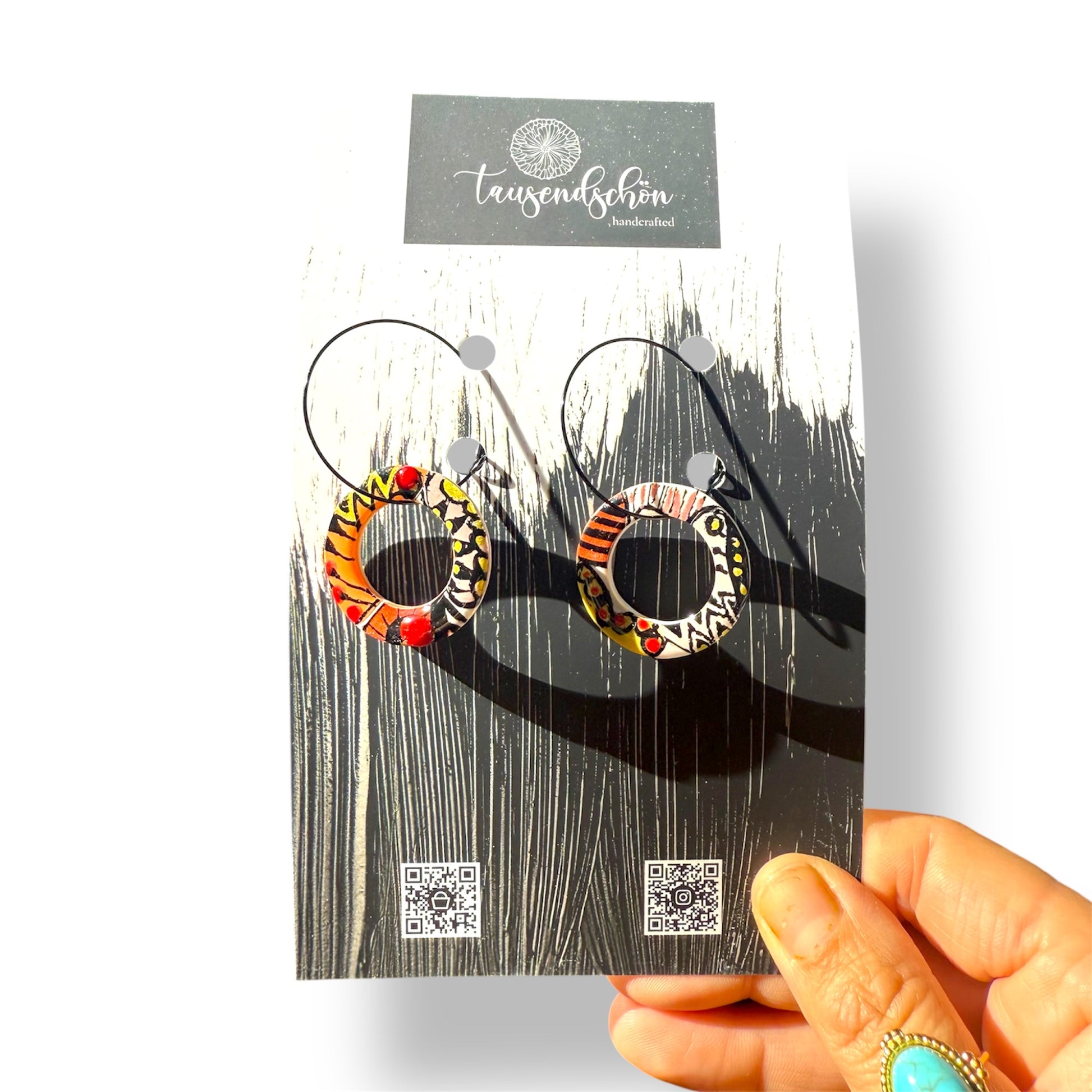 Unsere schöne Ohrringe werden aus einem ungiftigen PVC-basierten Medium namens Polymer Clay hergestellt. Wir formen es, mischen die Farben und fügen manchmal Dinge wie Folie oder Glitter hinzu, dann werden sie mit größter Sorgfalt ausgehärtet und fertiggestellt.