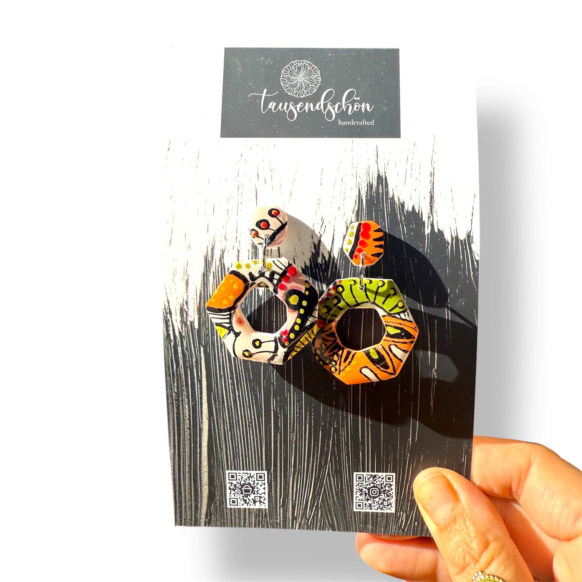 Unsere schöne Ohrringe werden aus einem ungiftigen PVC-basierten Medium namens Polymer Clay hergestellt. Wir formen es, mischen die Farben und fügen manchmal Dinge wie Folie oder Glitter hinzu, dann werden sie mit größter Sorgfalt ausgehärtet und fertiggestellt.