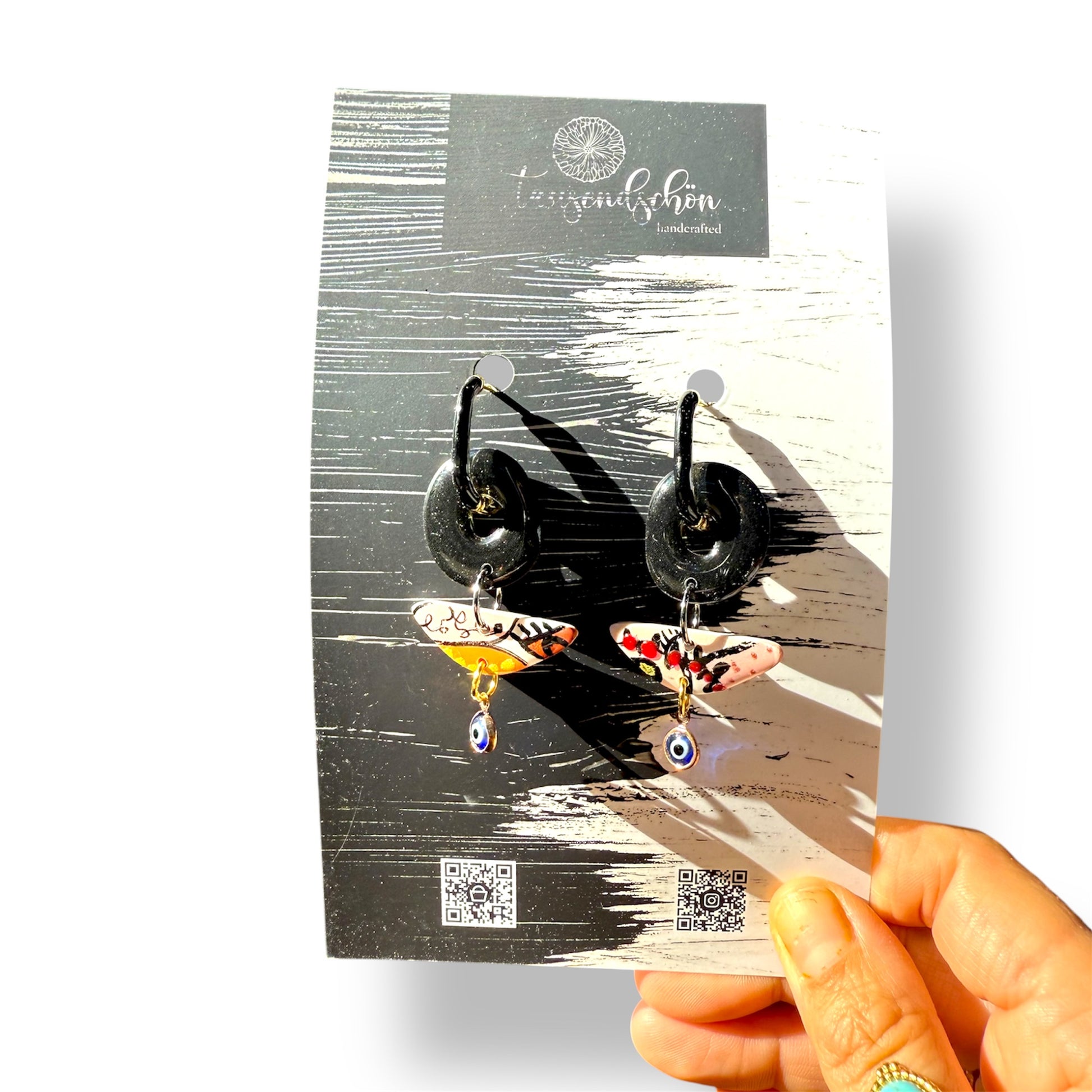 Unsere schöne Ohrringe werden aus einem ungiftigen PVC-basierten Medium namens Polymer Clay hergestellt. Wir formen es, mischen die Farben und fügen manchmal Dinge wie Folie oder Glitter hinzu, dann werden sie mit größter Sorgfalt ausgehärtet und fertiggestellt.
