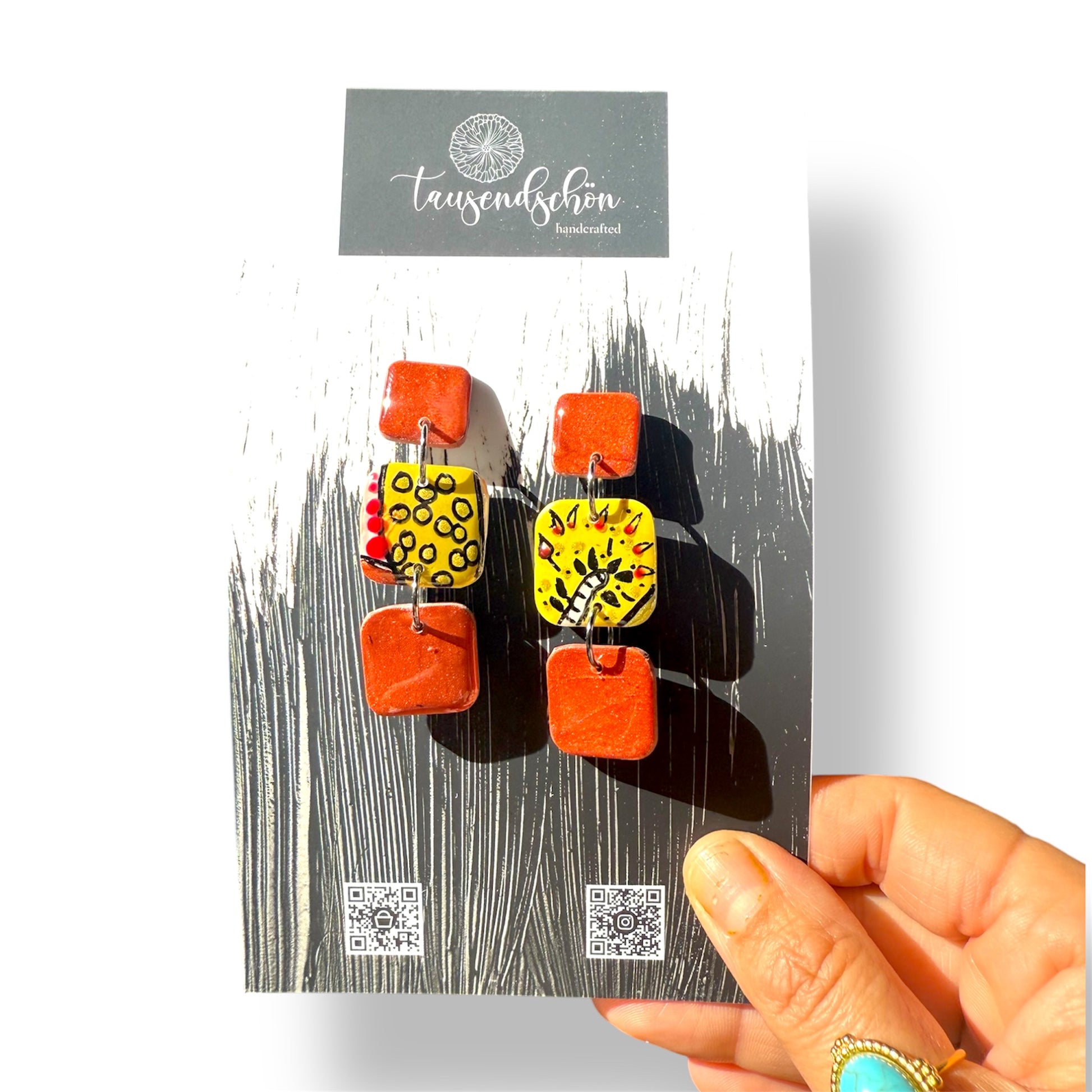 Unsere schöne Ohrringe werden aus einem ungiftigen PVC-basierten Medium namens Polymer Clay hergestellt. Wir formen es, mischen die Farben und fügen manchmal Dinge wie Folie oder Glitter hinzu, dann werden sie mit größter Sorgfalt ausgehärtet und fertiggestellt.