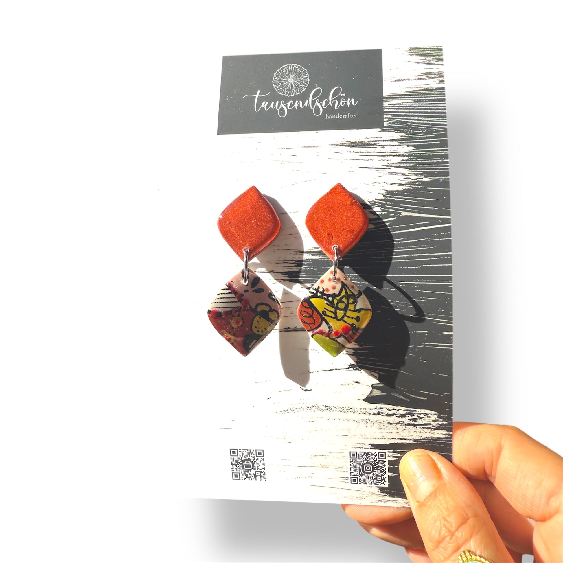 Unsere schöne Ohrringe werden aus einem ungiftigen PVC-basierten Medium namens Polymer Clay hergestellt. Wir formen es, mischen die Farben und fügen manchmal Dinge wie Folie oder Glitter hinzu, dann werden sie mit größter Sorgfalt ausgehärtet und fertiggestellt.