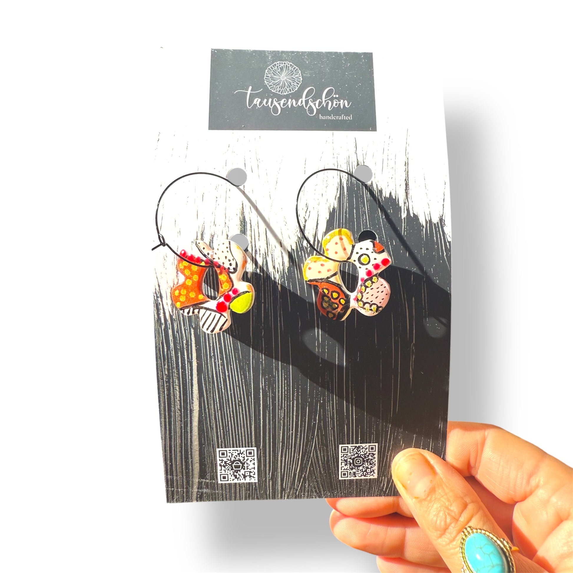 Unsere schöne Ohrringe werden aus einem ungiftigen PVC-basierten Medium namens Polymer Clay hergestellt. Wir formen es, mischen die Farben und fügen manchmal Dinge wie Folie oder Glitter hinzu, dann werden sie mit größter Sorgfalt ausgehärtet und fertiggestellt.