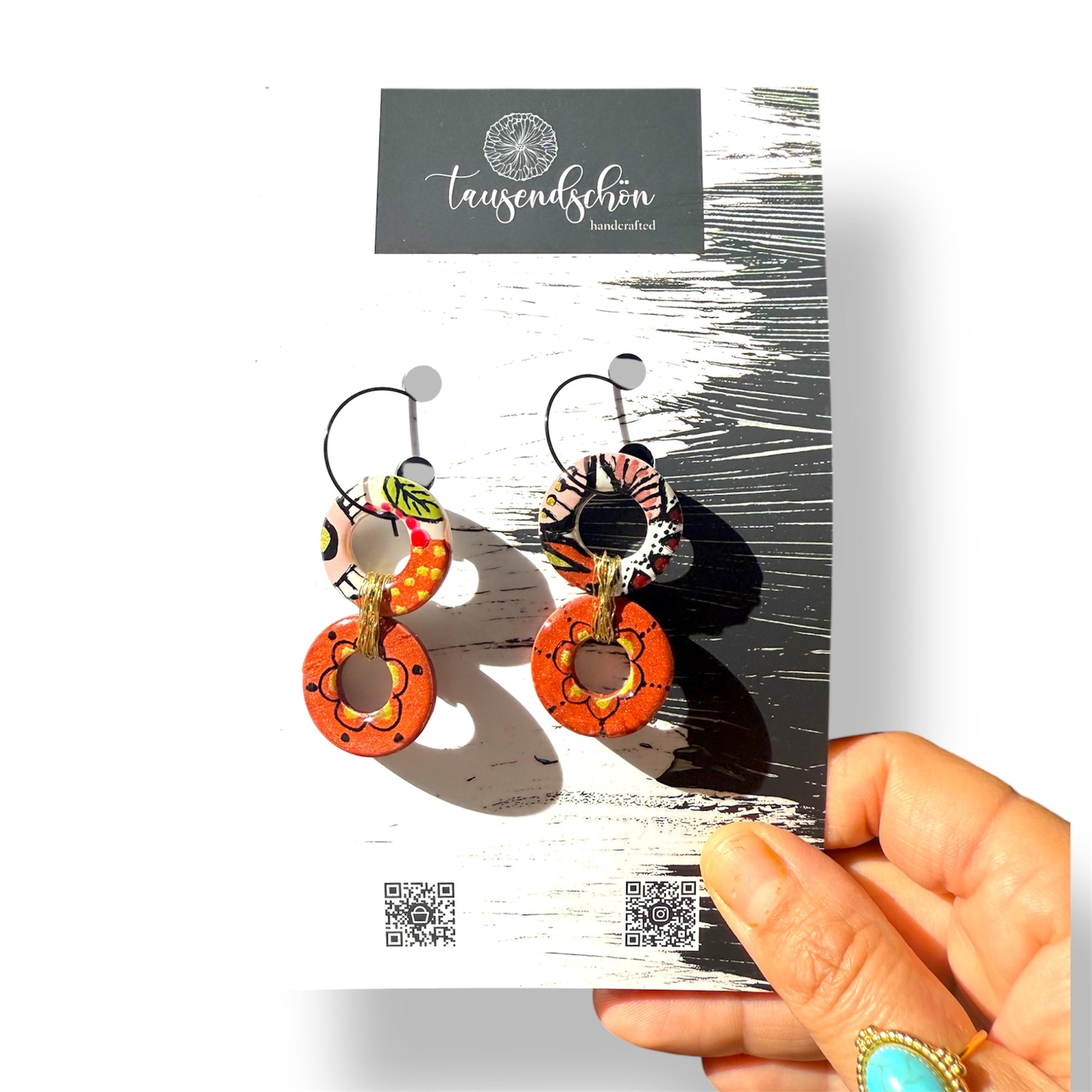 Unsere schöne Ohrringe werden aus einem ungiftigen PVC-basierten Medium namens Polymer Clay hergestellt. Wir formen es, mischen die Farben und fügen manchmal Dinge wie Folie oder Glitter hinzu, dann werden sie mit größter Sorgfalt ausgehärtet und fertiggestellt.