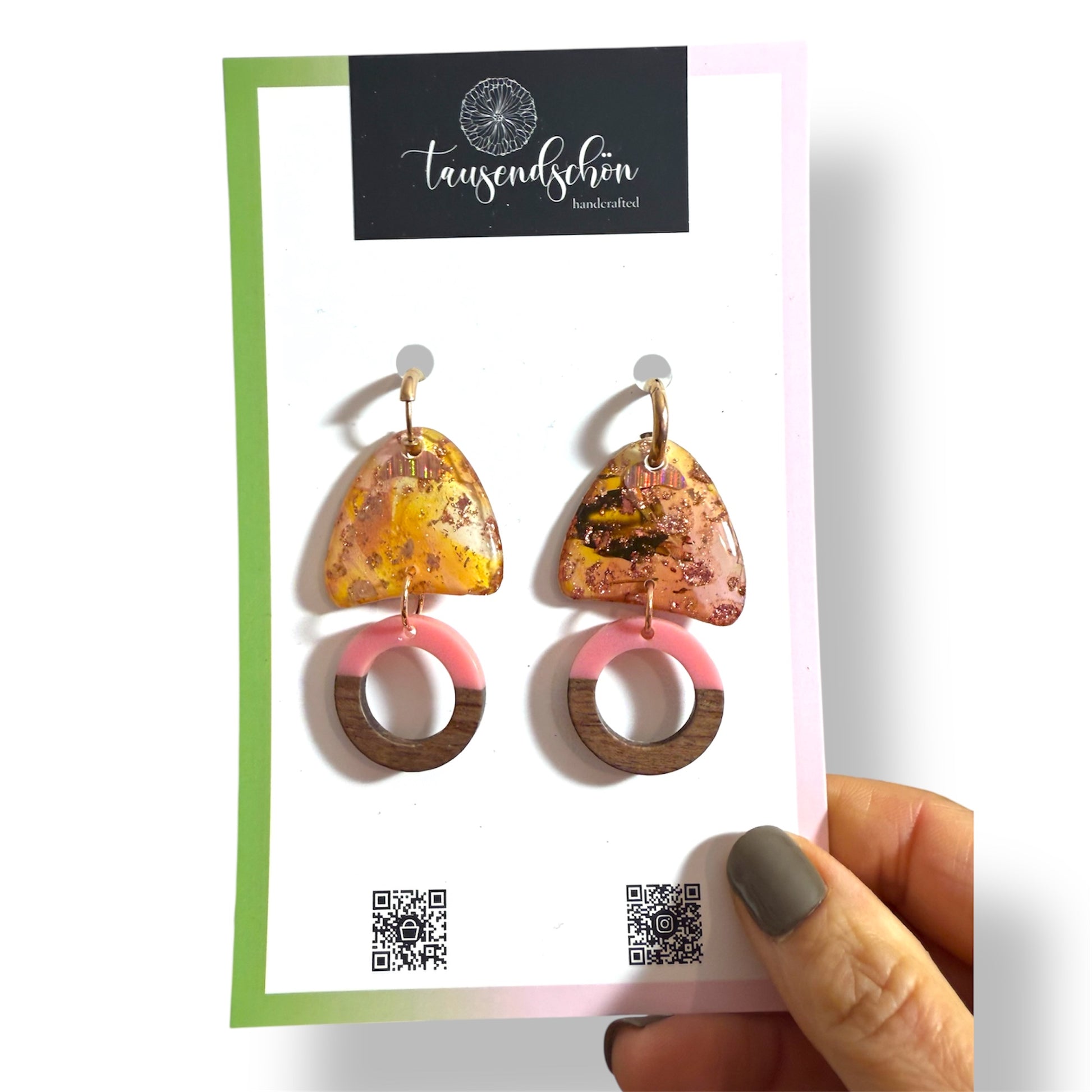 Unsere schöne Ohrringe werden aus einem ungiftigen PVC-basierten Medium namens Polymer Clay hergestellt. Wir formen es, mischen die Farben und fügen manchmal Dinge wie Folie oder Glitter hinzu, dann werden sie mit größter Sorgfalt ausgehärtet und fertiggestellt.
