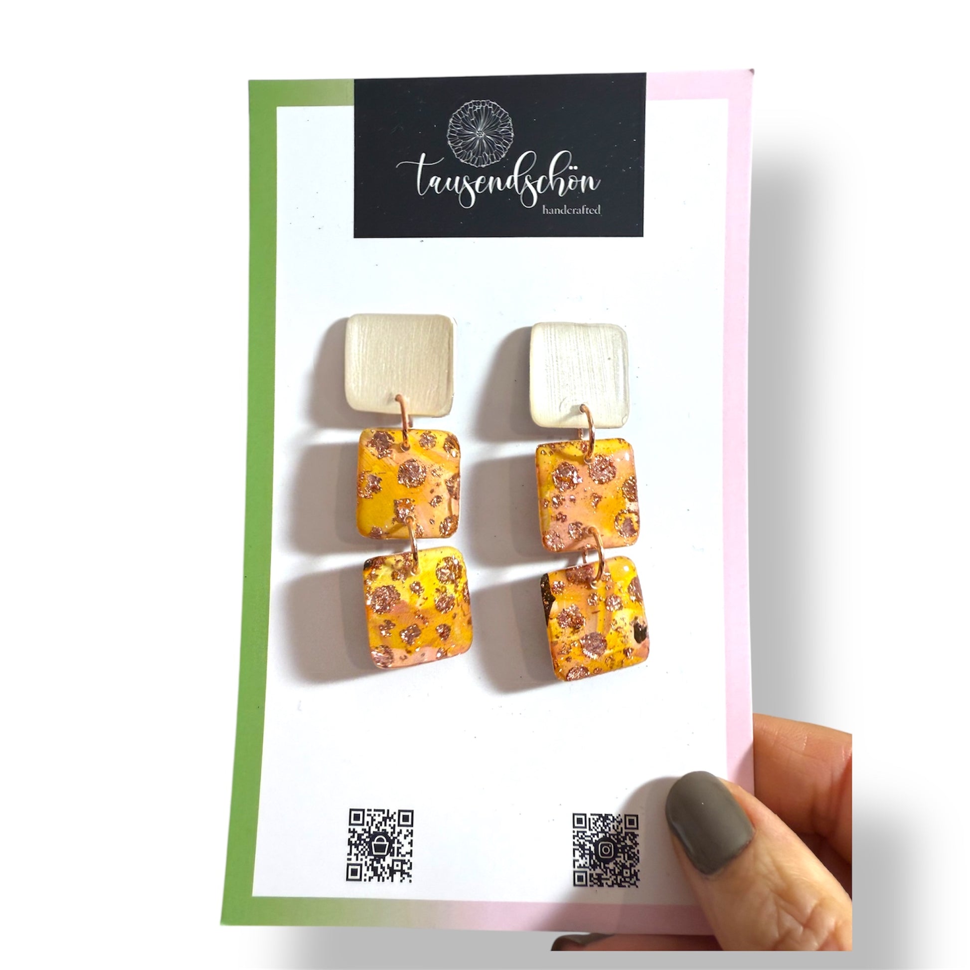 Unsere schöne Ohrringe werden aus einem ungiftigen PVC-basierten Medium namens Polymer Clay hergestellt. Wir formen es, mischen die Farben und fügen manchmal Dinge wie Folie oder Glitter hinzu, dann werden sie mit größter Sorgfalt ausgehärtet und fertiggestellt.