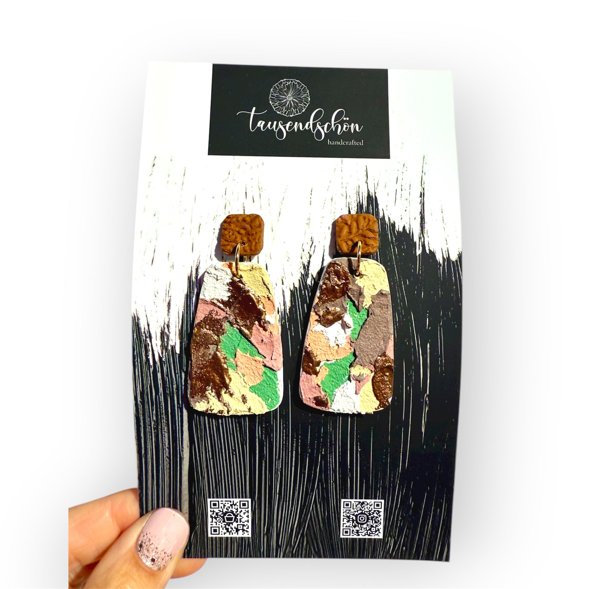 Unsere schöne Ohrringe werden aus einem ungiftigen PVC-basierten Medium namens Polymer Clay hergestellt. Wir formen es, mischen die Farben und fügen manchmal Dinge wie Folie oder Glitter hinzu, dann werden sie mit größter Sorgfalt ausgehärtet und fertiggestellt.