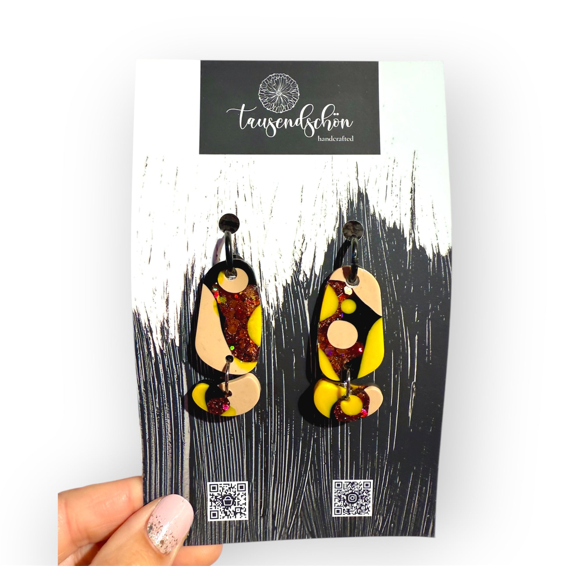 Unsere schöne Ohrringe werden aus einem ungiftigen PVC-basierten Medium namens Polymer Clay hergestellt. Wir formen es, mischen die Farben und fügen manchmal Dinge wie Folie oder Glitter hinzu, dann werden sie mit größter Sorgfalt ausgehärtet und fertiggestellt.
